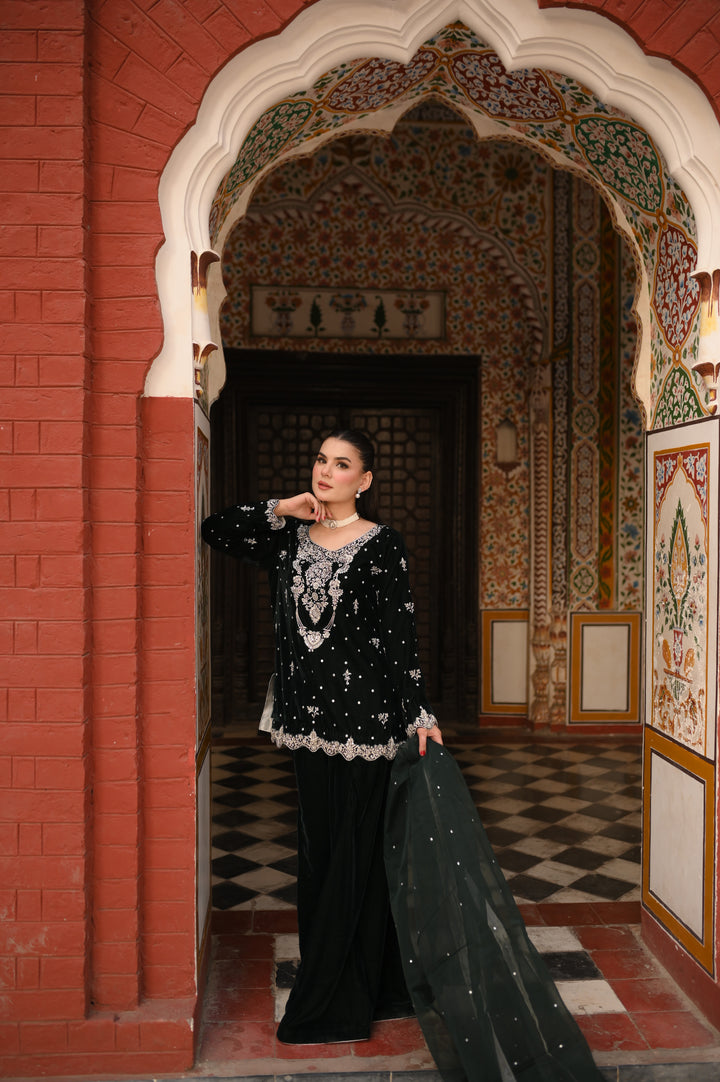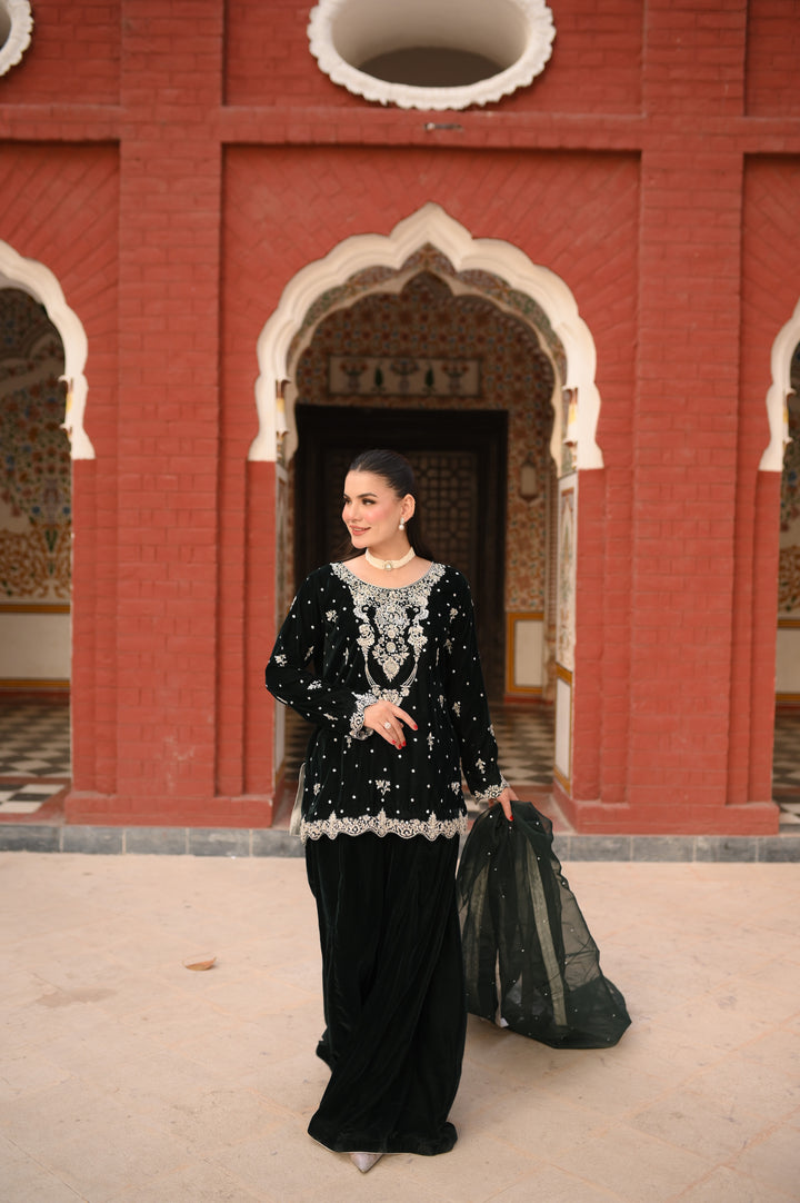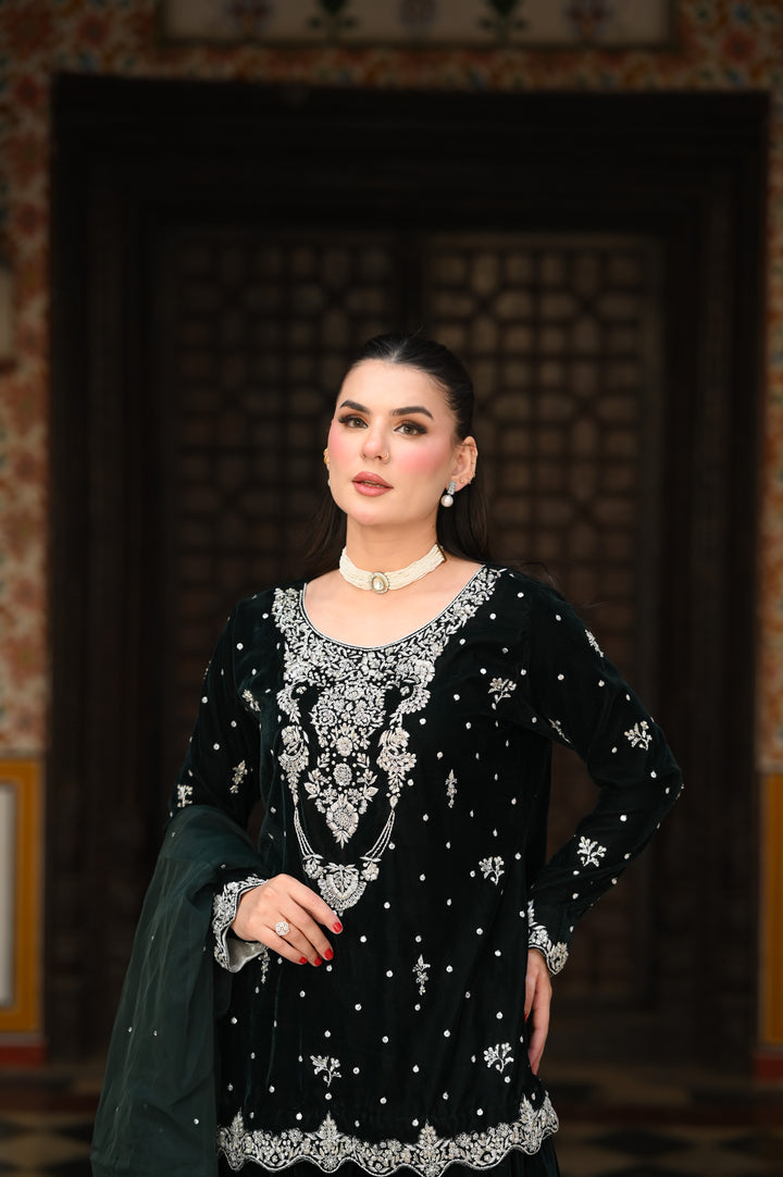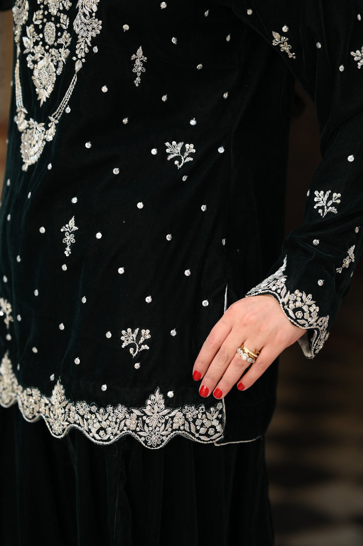 Shirt: Premium deep emerald velvet intricately hand-embroidered with silver zardozi, dabka, and pearls. The neckline and hem are finished with crystal chains and scalloped borders for a luminous, royal touch.