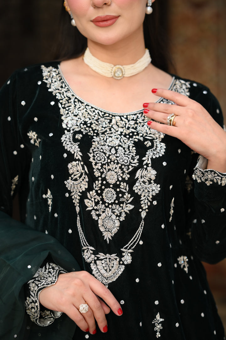 Deep Emerald Velvet base with Silver Zardozi, Dabka, and Pearl embellishments — accentuated with crystal vines and delicate Resham detailing.
