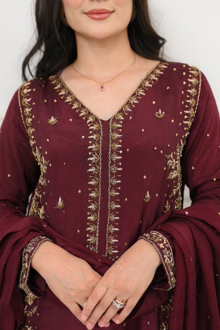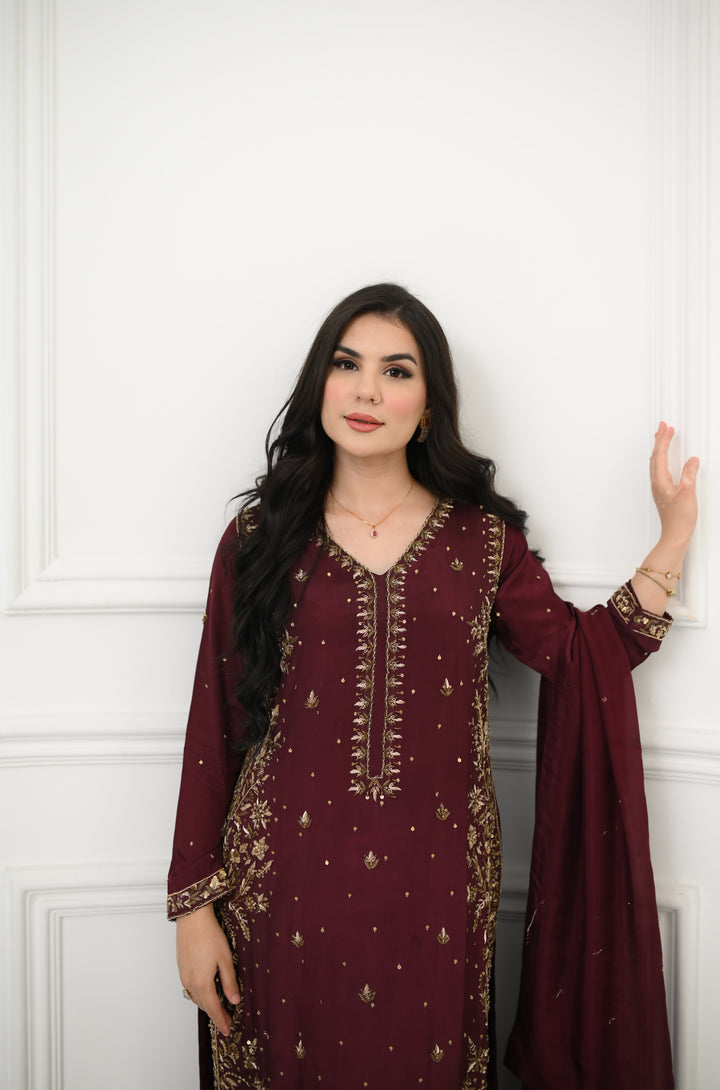 Rich Deep Maroon base with Antique Gold Zari, Golden Sequins