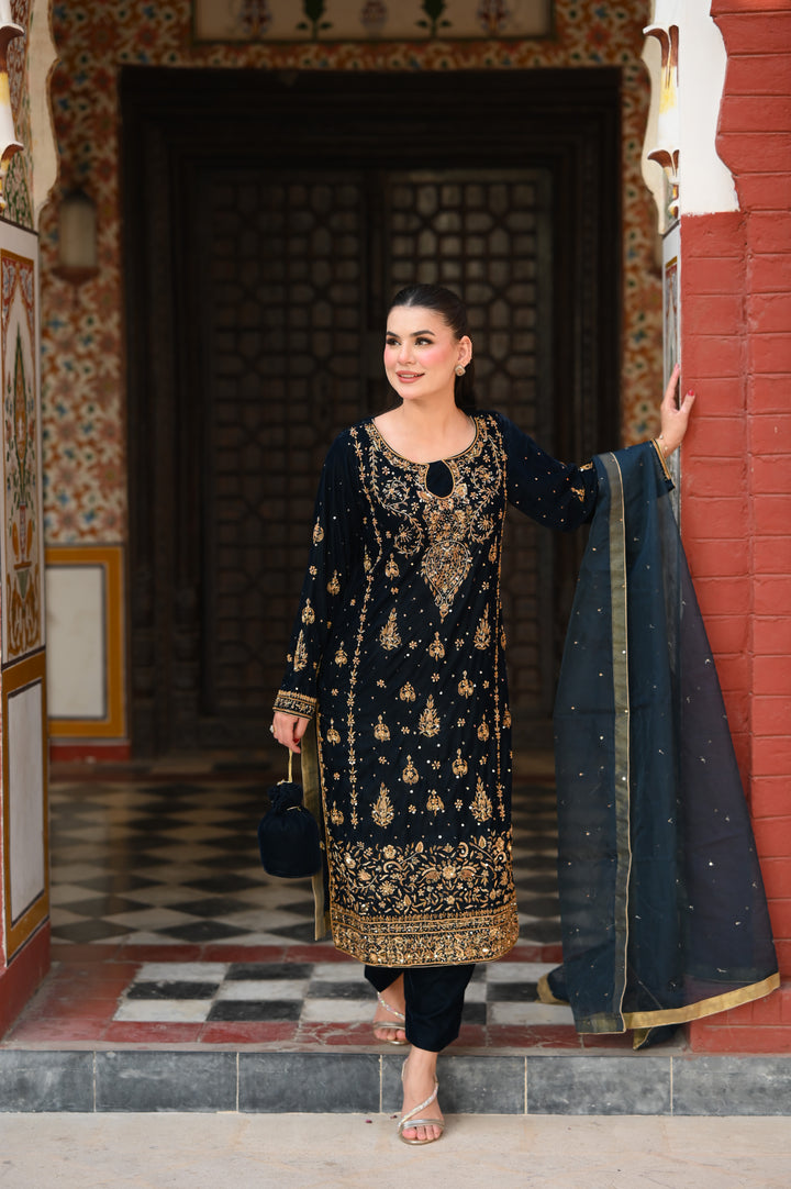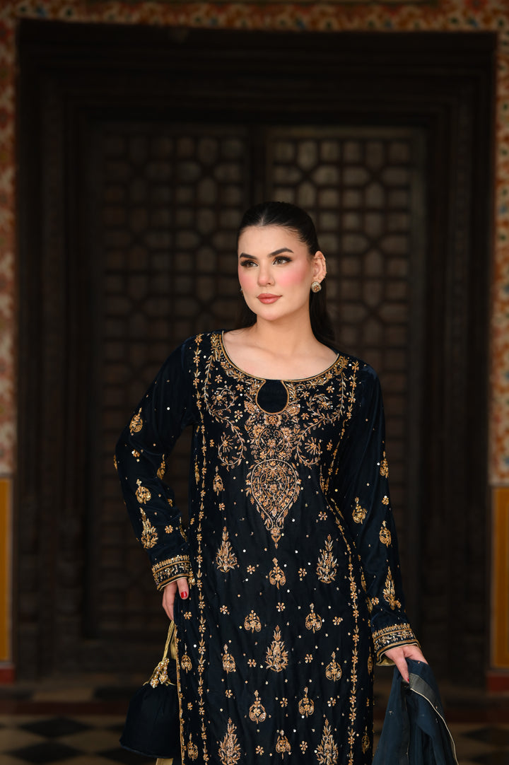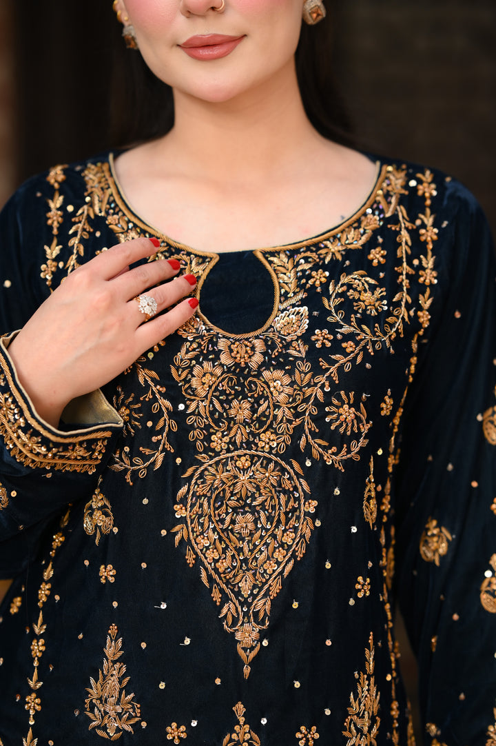 Premium dark teal velvet adorned with intricate antique gold dabka, zari, and resham embroidery, highlighted by hand-set crystals and mirror detailing on the neckline and borders.