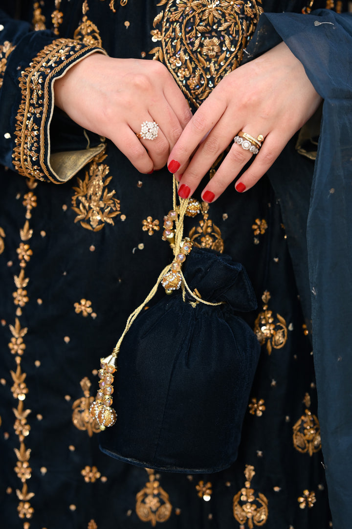 Potli: Matching velvet potli with gold tassel accents — completing the look with traditional grace.