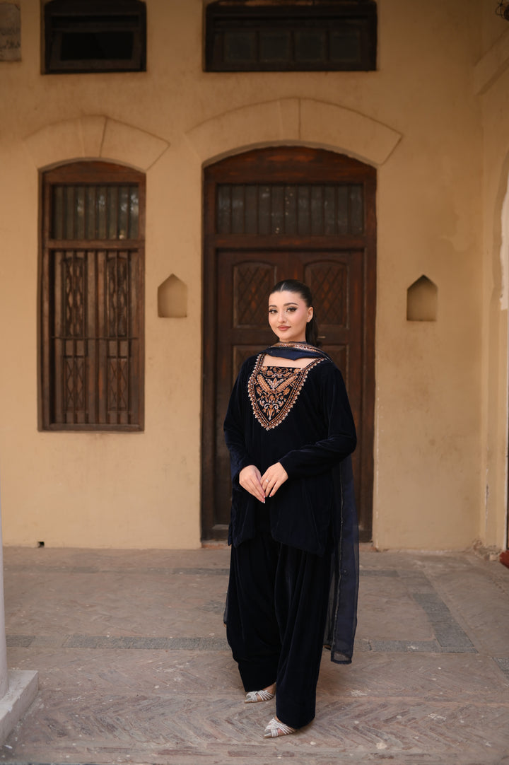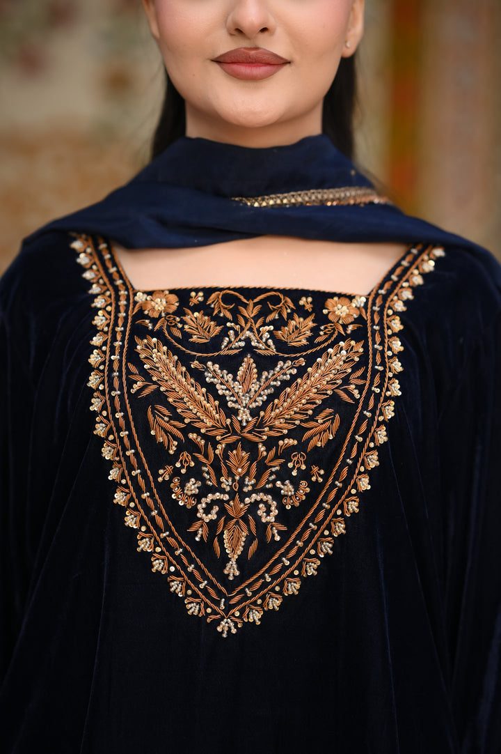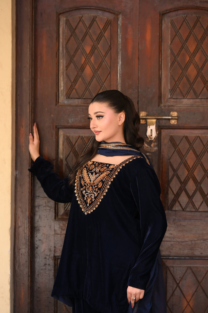 Shirt: Premium navy velvet with a square neckline intricately embroidered in antique copper zari and resham, framed by silver crystals and sequin detailing. The design forms a regal V-shaped motif inspired by Mughal craftsmanship.