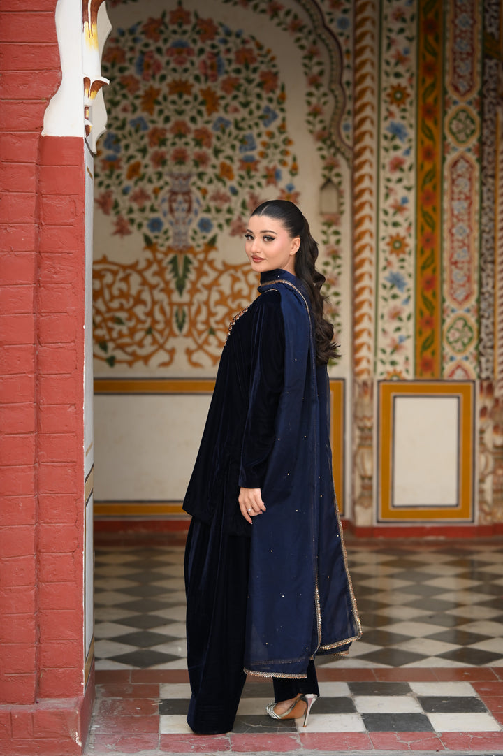 Trousers: Coordinated navy farshi shalwar for a structured silhouette.