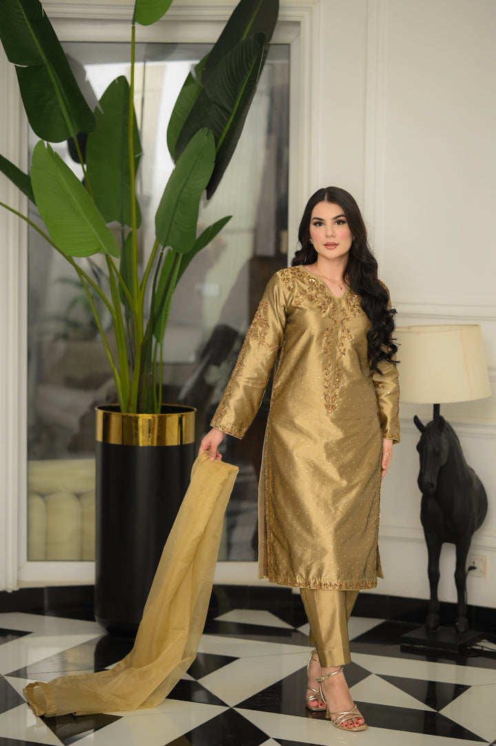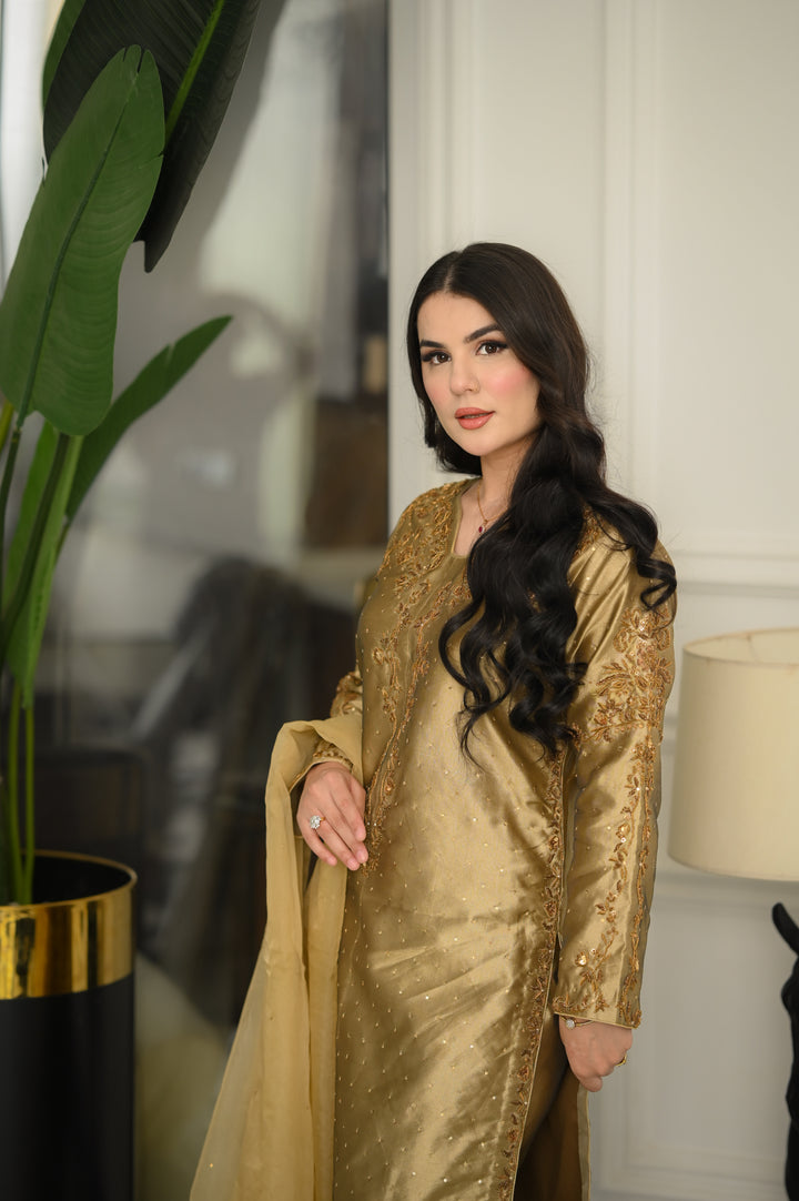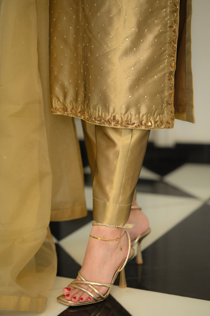Dupatta: Organza in matching antique gold tone