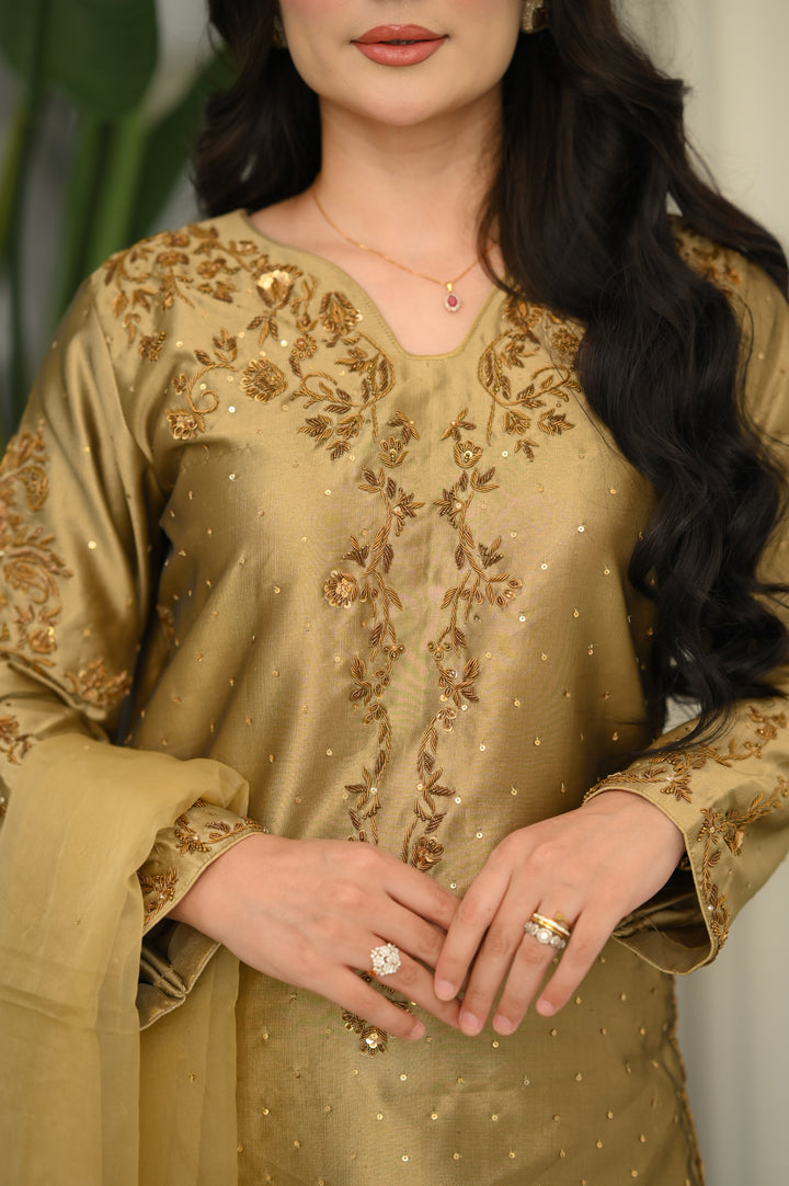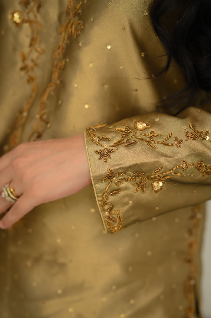 Antique Gold base with Copper-Gold Threadwork, Soft Sequin Highlights